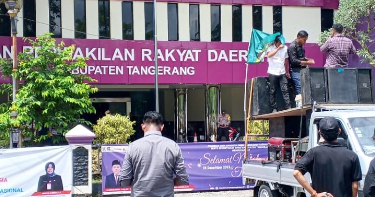 Tangerang - Aksi unjuk rasa masyarakat yang tergabung dalam Aliansi Solidaritas Masyarakat Tangerang Raya dan Serikat buruh digelar di Pusat Pemerintahan Kabupaten Tangerang pada Selasa, (23/12/2025).